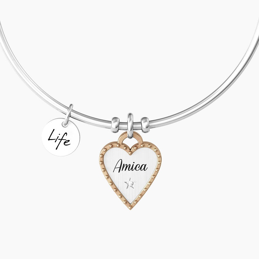 Bracciale Da Donna Di Kidult Della Collezione Love. Bracciale Bangle In Acciaio 316L, Con Ciondolo Cuore Allungato In Acciaio Satinato E Bordo In Pvd Rosé Lucido Con Borchie E Cristalli. Scritta: Amica Sei Unica. Dimensioni: Cuore 15.60X20 Mm, Cristalli 1.50 Mm.