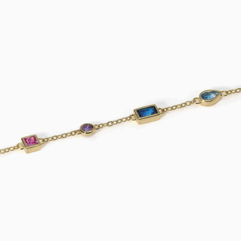 Bracciale da donna multicolor in argento placcato oro 18k con catena forzatina e castoni di taglio differente. Chiusura con moschettone. Misura regolabile, lunghezza da 16 a 19 cm. Materiale: Argento 925, Zirconi. Finitura: Placcatura in oro 18k.