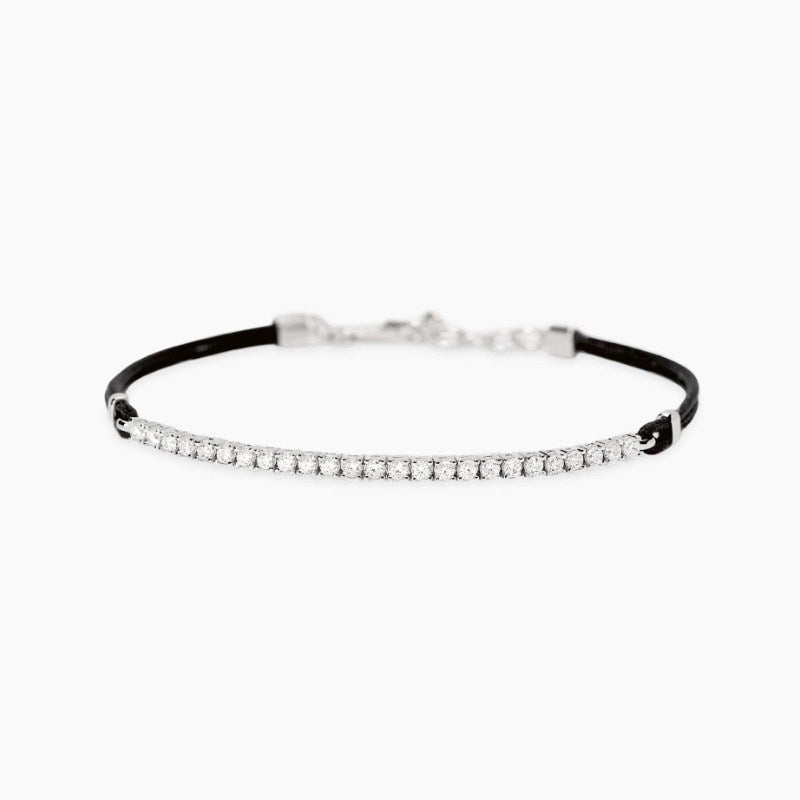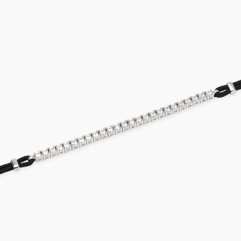 Bracciale regolabile in argento rodiato con cordino in nylon nero e tennis di zirconi bianchi. Dimensione tennis centrale: 67x20 mm. Diametro zirconi: 2 mm. Misura regolabile, lunghezza da 18,5 a 20,5 cm. Chiusura con moschettone. Materiale: Argento rodiato 925, Zirconi, Nylon.