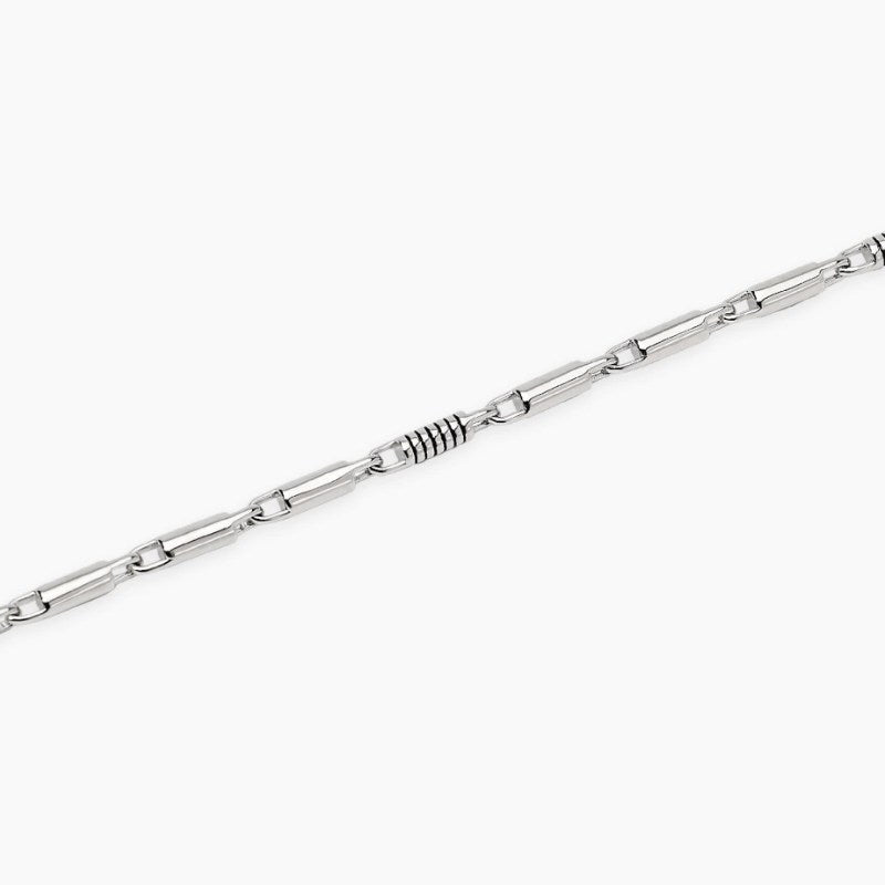 Bracciale regolabile in argento rodiato con cilindri lucidi e incisioni nere. Dimensione cilindri: 6x2,6 mm. Diametro zirconi neri: 1,5 mm. Misura regolabile, lunghezza da 18,5 a 20,5 cm. Chiusura con moschettone. Materiale: Argento rodiato 925.