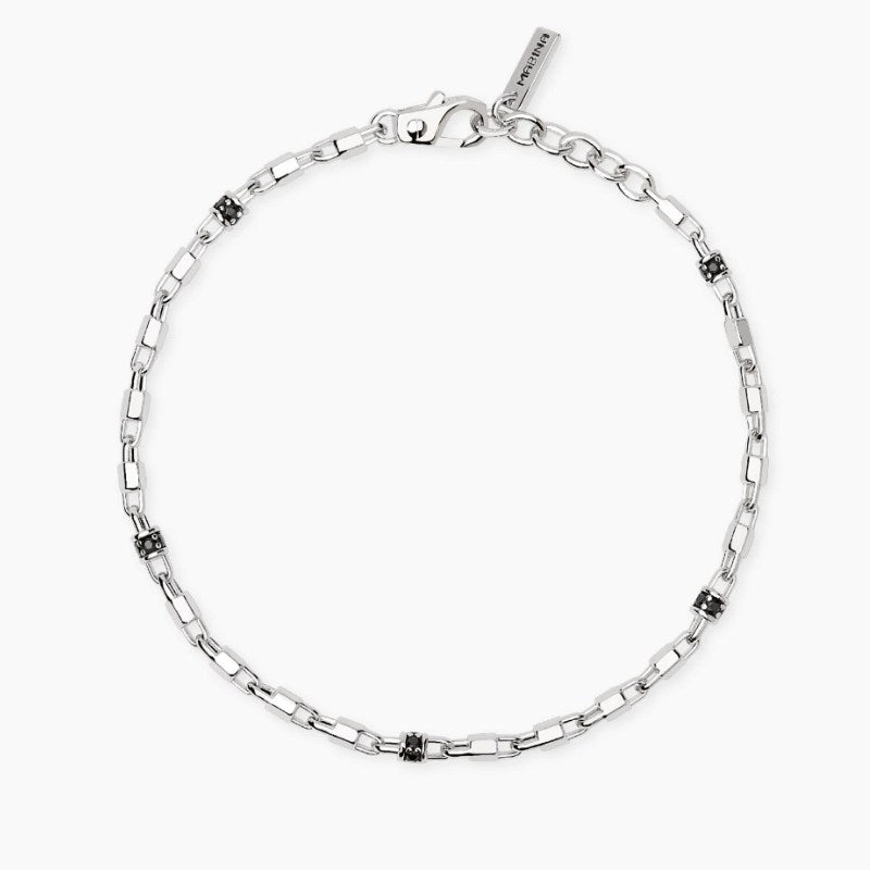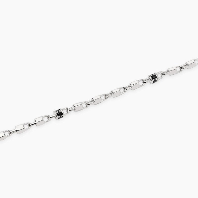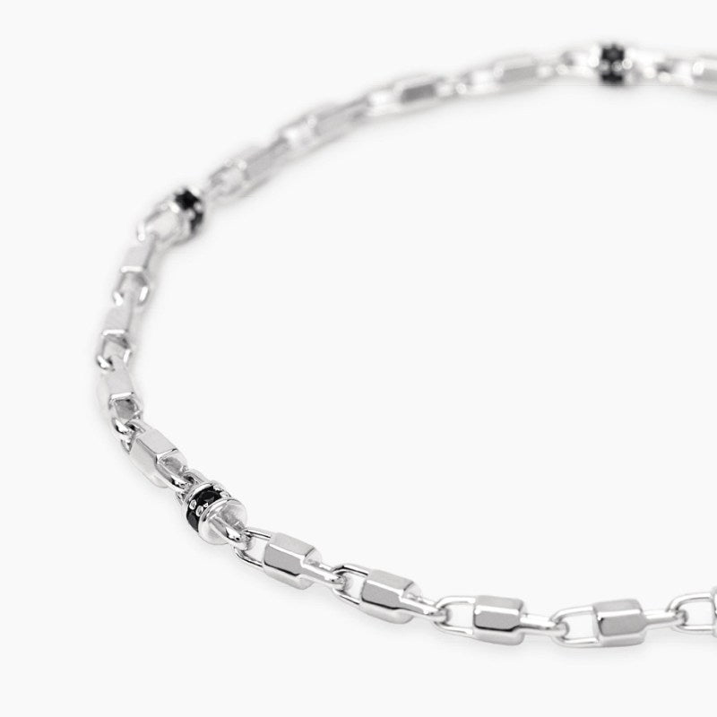 Bracciale regolabile in argento rodiato con elementi esagonali e zirconi neri. Dimensione elementi esagonali: 3x2,6 mm. Diametro zirconi neri: 1,5 mm. Misura regolabile, lunghezza da 18,5 a 20,5 cm. Chiusura con moschettone. Materiale: Argento rodiato 925, Zirconi.