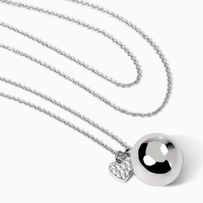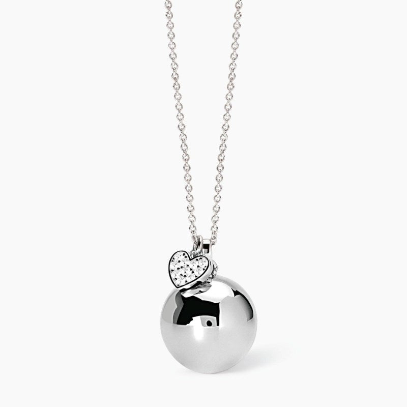Collana da donna in argento rodiato con catena rolò, ciondolo Chiama Angeli e ciondolo a forma di cuore con zirconi. Larghezza della catena: 1,5 mm. Diametro elemento pendente: 18 mm. Dimensione elemento cuore: 8,5 x 8 mm. Diametro degli zirconi: 1,75 mm. Misura unica, lunghezza 85 cm. Materiale: Argento 925, Zirconi.
