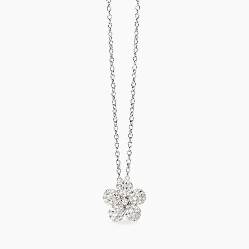 Girocollo in argento con catena forzatina diamantata e ciondolo fiore in zirconi. Dimensione catena: 1,2 mm. Dimensione fiore: 11,4x11 mm. Diametro zirconi: 1 e 2 mm. Misura regolabile dalla 39 alla 43 cm. Materiale: Argento rodiato 925, Zirconi.