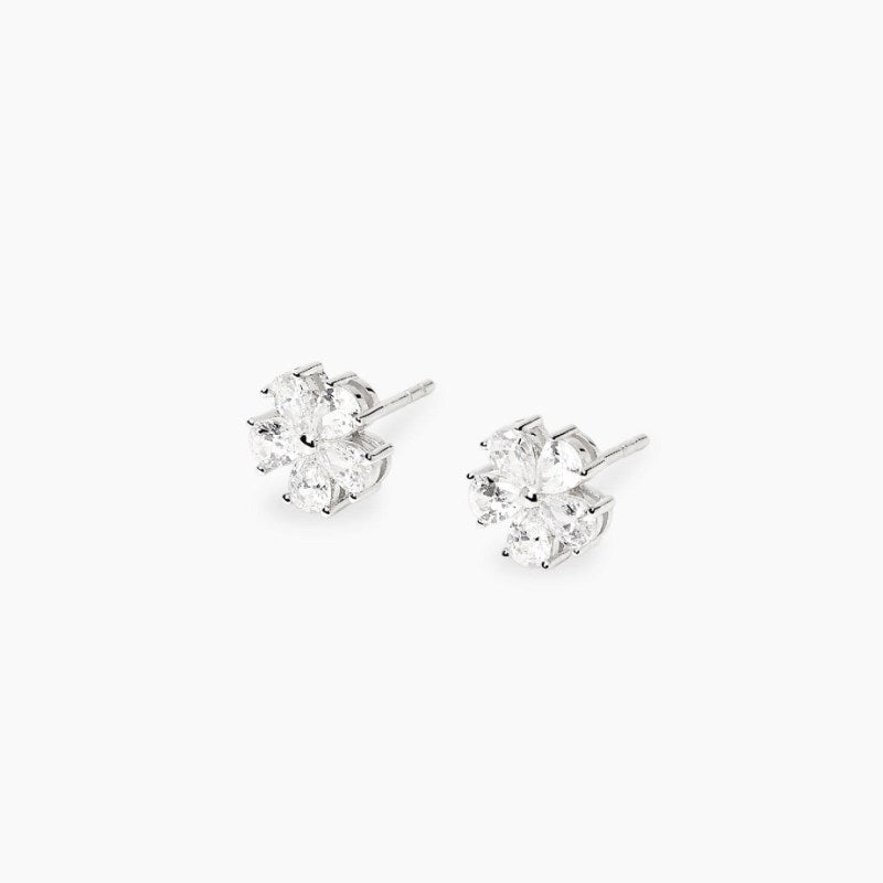 Orecchini in argento rodiato con fiore in zirconi bianchi taglio goccia. Dimensione fiore: 8,6x8,4 mm. Diametro zirconi taglio goccia: 2,5x4 mm. Materiale: Argento rodiato 925, Zirconi.