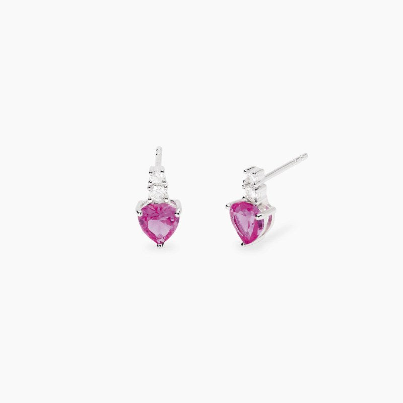 Orecchini in argento rodiato con pendente cuore in corindone rosa sintetico. Dimensione corindone sintetico taglio cuore: 6x6 mm. Diametro zirconi: 2 e 2,5 mm. Lunghezza tot. orecchino: 1,1 cm. Materiale: Argento rodiato 925, Zirconi, Corindone sintetico.