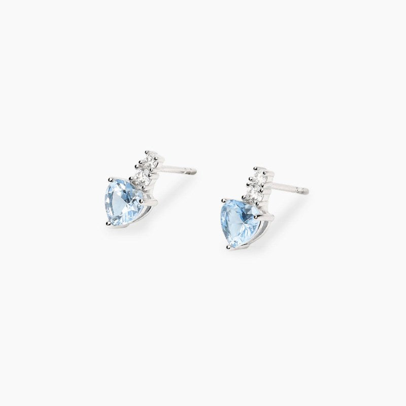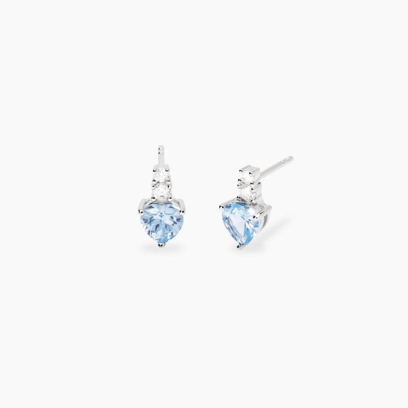 Orecchini in argento rodiato con zirconi e pendente cuore in acquamarina sintetica. Dimensione acquamarina sintetica: 6x6 mm. Diametro zirconi: 2 e 2,5 mm. Lunghezza tot. orecchino: 1,1 cm. Materiale: Argento rodiato 925, Zirconi, Acquamarina sintetica.