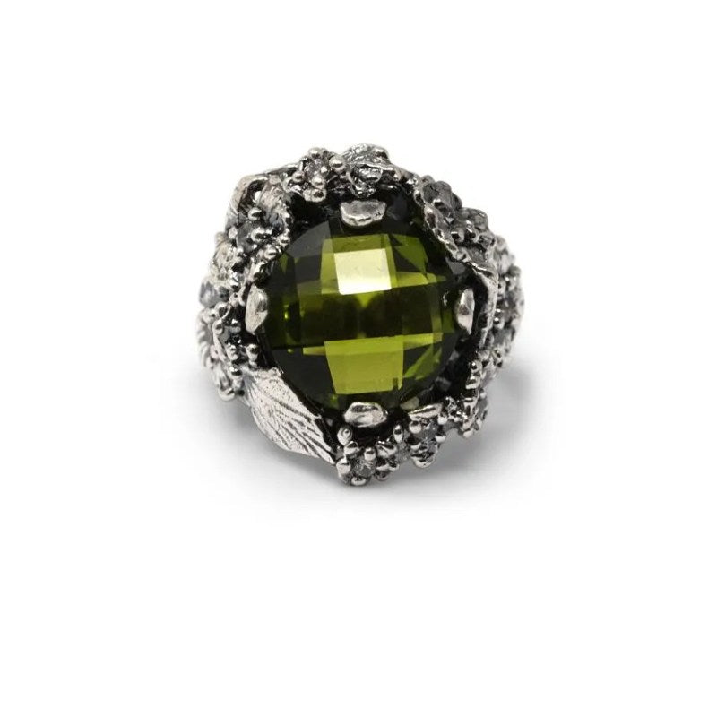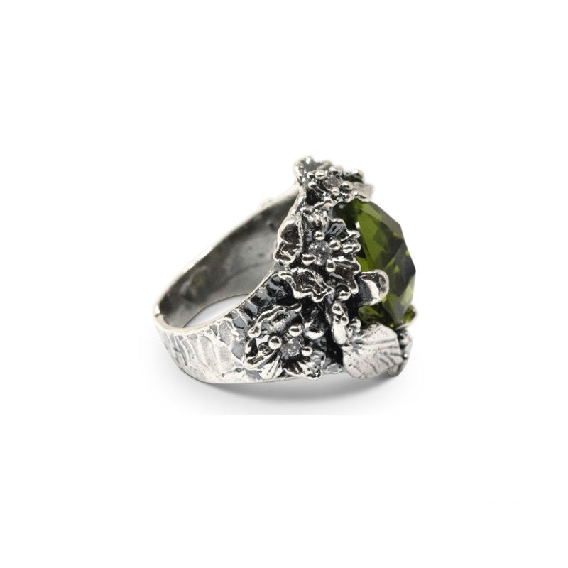 Anello in Argento 925/000 cristalli colorati e zirconi.  Realizzato a mano in Italia su misura è corredato di Garanzia e Certificato di Autenticità. Pietre Incassate 8 Zirconi. Pietra Centrale Cristallo Peridoto14 mm Peridoto. Dimensioni 3 x 2 cm. Anello regolabile.