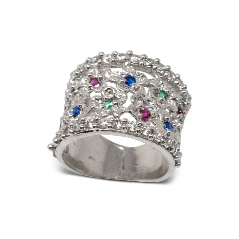 Anello in Argento 925/000 e zirconi. Realizzato a mano in Italia su misura ed è corredato di Garanzia e Certificato di Autenticità. Pietre Incassate 39. Pietre Zirconi. Larghezza fascia 1.7 cm. Misura Anello 12.