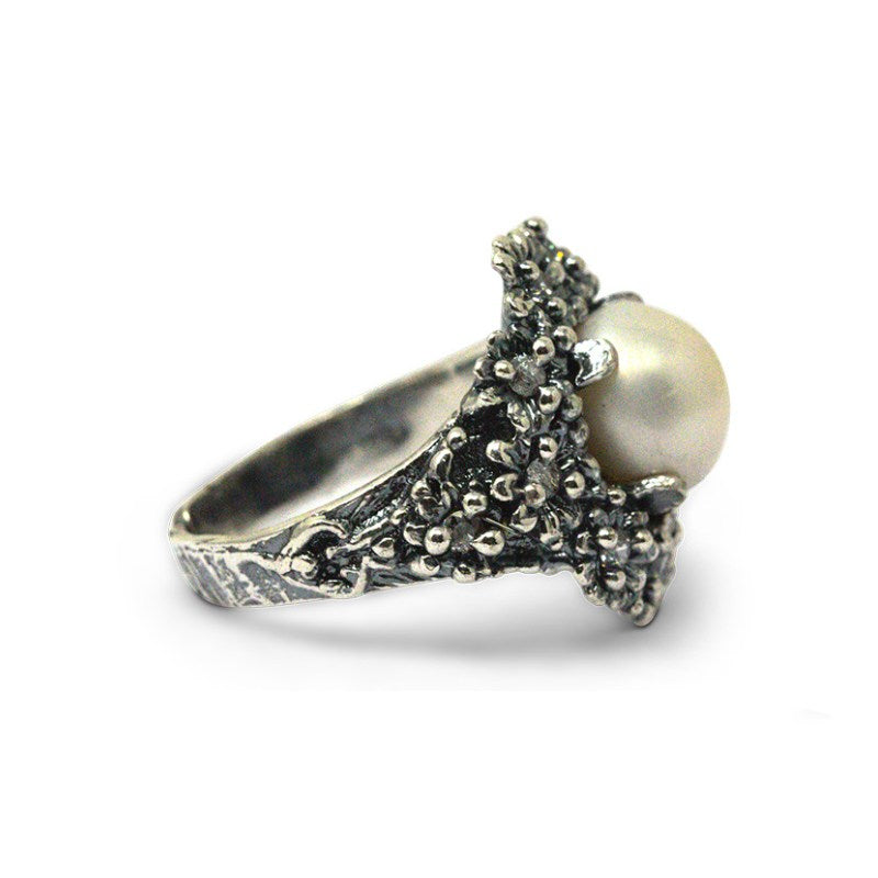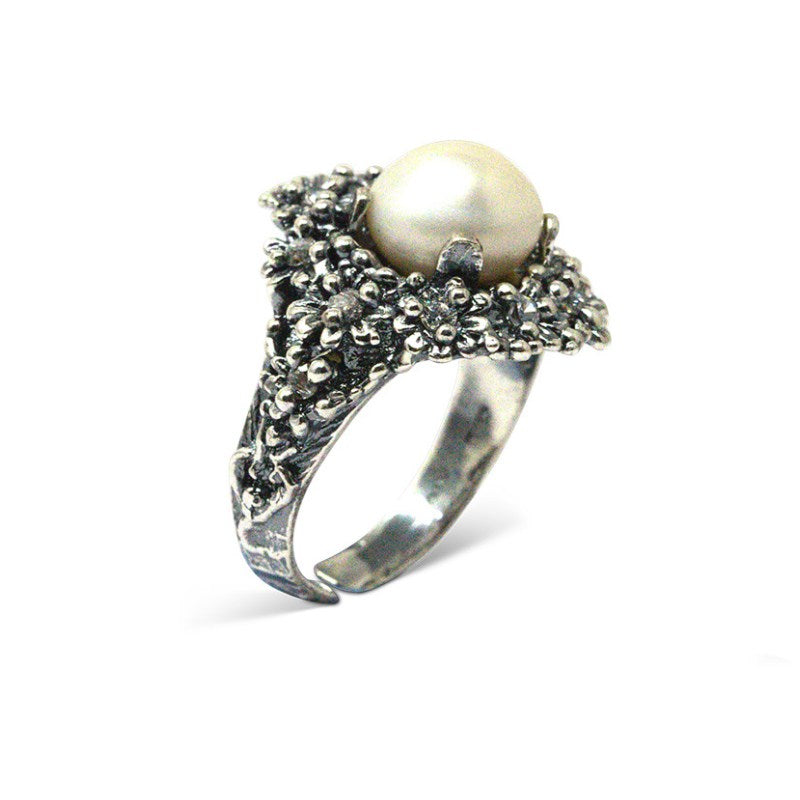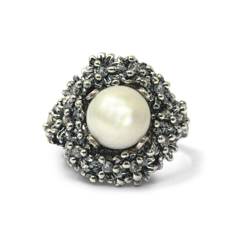Anello in Argento 925/000 e zirconi e perla naturale . Realizzato a mano in Italia su misura ed è corredato di Garanzia e Certificato di Autenticità. Diametro 2,2 cm. Pietre Zirconi. Numero Pietre 10. Perla Naturale 11 mm. Anello regolabile.