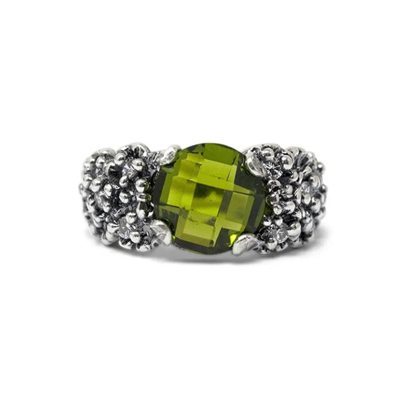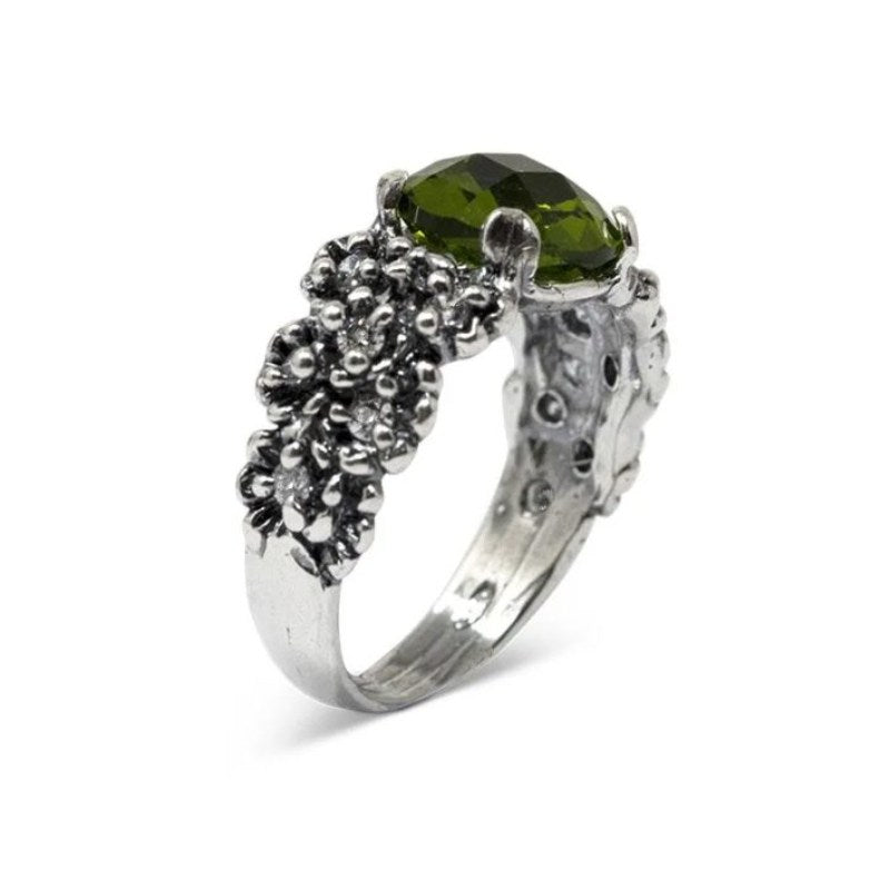 Anello in Argento 925/000, zirconi e cristallo colorato . Realizzato a mano in Italia su misura ed è corredato di Garanzia e Certificato di Autenticità. Dimensioni h 1 cm. Pietre Zirconi colore Bianco. Numero Pietre 12. Cristallo 10 mm Colore Peridoto. Anello regolabile.