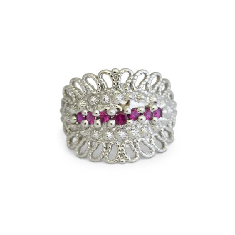 Anello in Argento 925/000 e zirconi. Realizzato a mano in Italia e corredato di Garanzia e Certificato di Autenticità. Dimensione  h 1,6 cm. Pietre incassate  7. Pietre Zirconi Rossi. Misura 16.