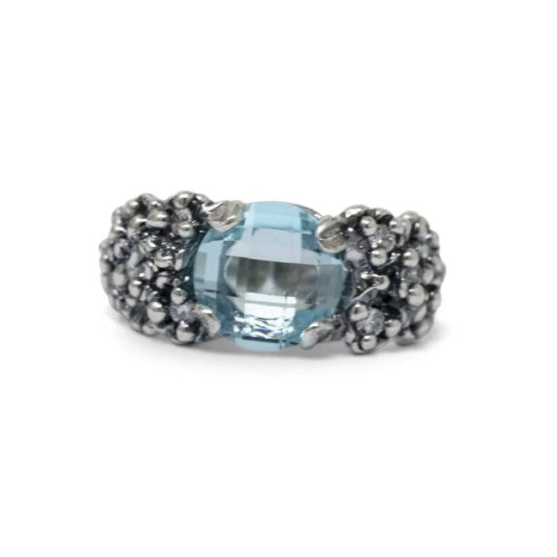 Anello in Argento 925/000, zirconi e cristallo colorato . Realizzato a mano in Italia su misura ed è corredato di Garanzia e Certificato di Autenticità. Dimensioni h 1 cm. Pietre Zirconi colore Bianco. Numero Pietre 12. Cristallo 10 mm Colore topazio azzurro. Misura regolabile.
