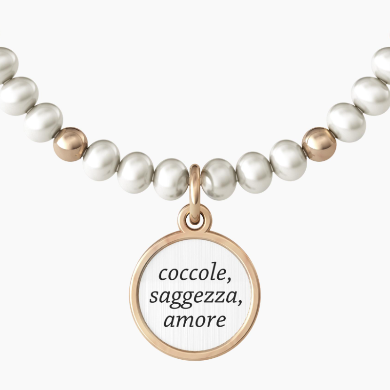 Bracciale elastico con perle coltivate e sfere color oro rosato. Collezione Family. Ciondolo tondo con rifinitura lucida in contrasto, con frase "Grazie nonna" sul fronte con punto luce a forma di stella. Sul retro incisione "Coccole saggezza amore". Un gioiello per ringraziarla per tutto l'amore ricevuto. Dimensione del ciondolo: 15 mm. Diametro del cristallo: 1,50 mm. Diametro delle perle: 4.5/5 mm. Misura unica, lunghezza 17/18 cm . Materiale: Acciaio 316L, Rose Gold Pvd, Perle coltivate, Cristallo