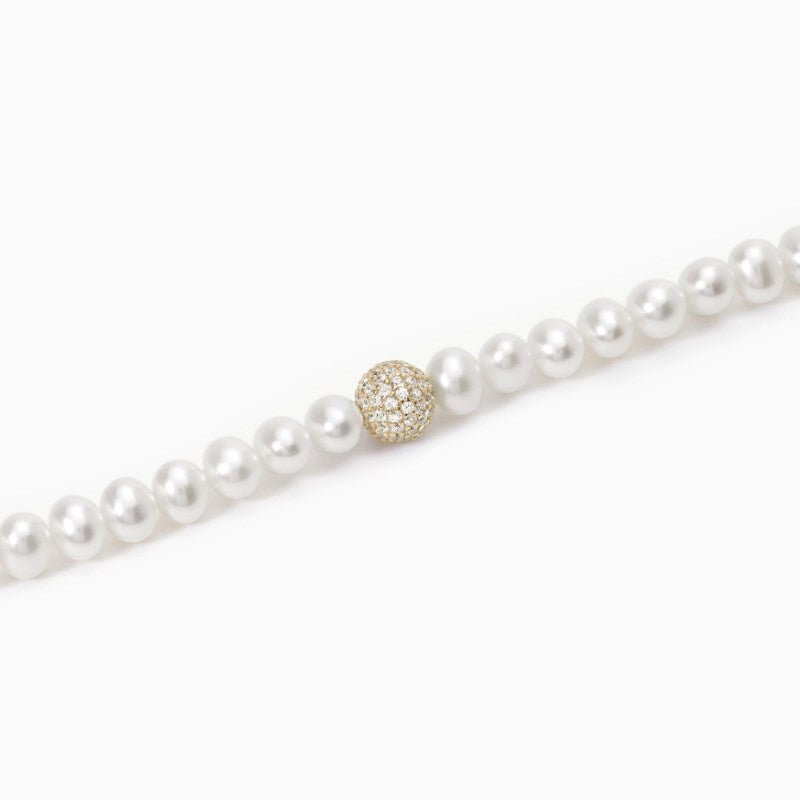Bracciale con perle coltivate e sfera in argento placcato oro 18k con pavè. Diametro perle: 4.5 - 5 mm. Misura regolabile, lunghezza da 16 a 19 cm. Chiusura con moschettone. Materiale: Argento 925, Perle coltivate, Zirconi bianchi. Finitura: Placcatura in oro 18k.