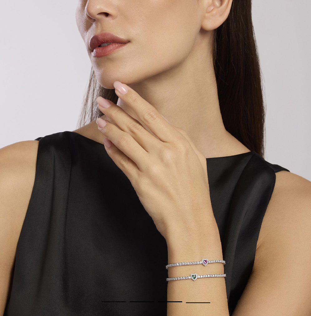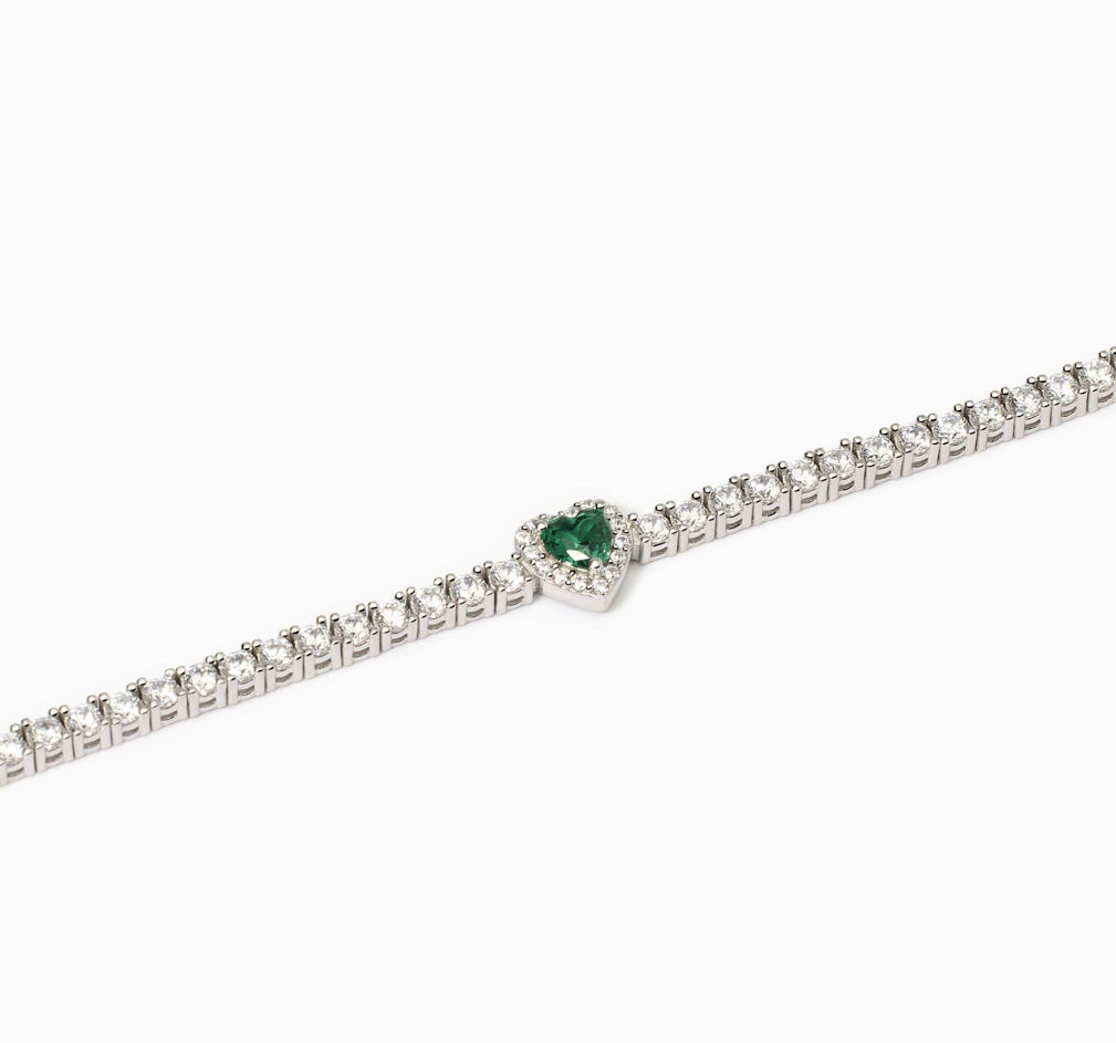 Bracciale tennis da donna in argento rodiato con smeraldo sintentico centrale taglio cuore e zirconi. Incastonatura zirconi a griffe. Dimensione del cuore: 4 x 4 mm. Diametro degli zirconi: 1 e 2 mm. Misura small, lunghezza 16 cm. Chiusura a pinza con molla. Materiale: Argento 925, Smeraldo sintetico, Zircone