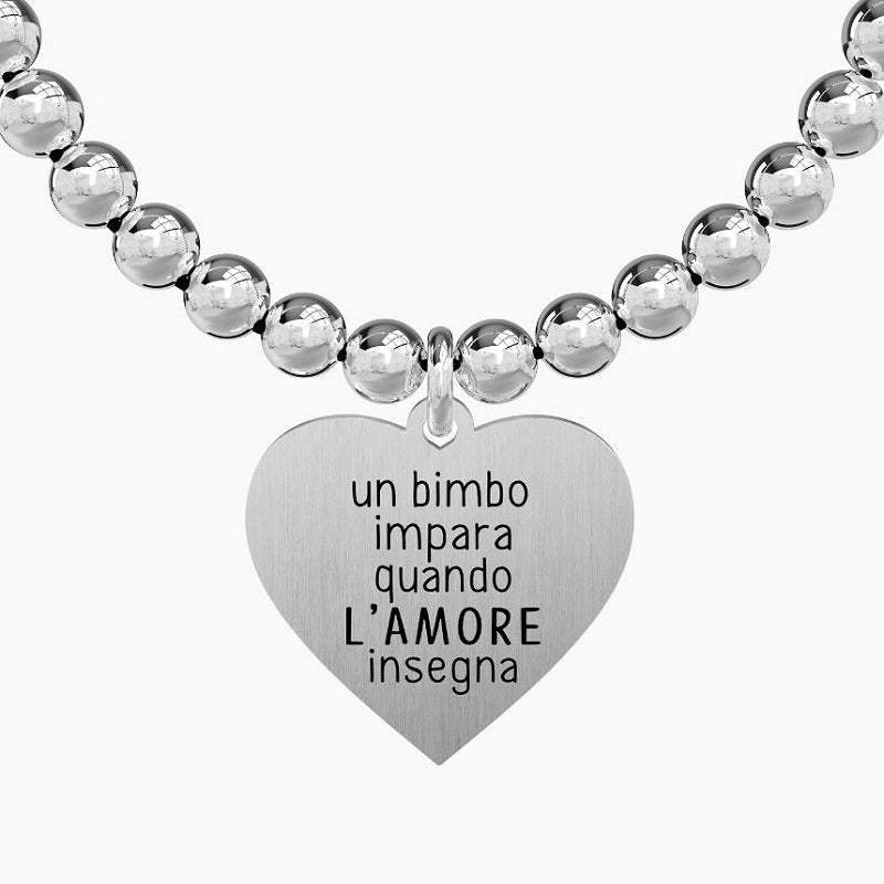 Bracciale elastico con sfere in acciaio e ciondolo satinato a cuore. Collezione Love. Incisione smaltata sul ciondolo e cristallo sul retro. Chiusura con cordino. Misura regolabile, diametro da 5 a 6,5 cm. Materiale: Acciaio 316L, Cristallo.