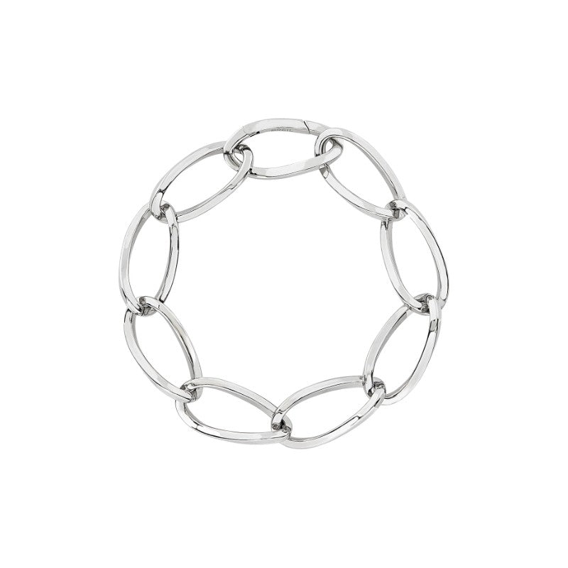Bracciale da donna in acciaio Breil collezione Hoop. Bracciale realizzato con catena ad elementi ovali in acciaio anallergico 316L rodiato. Lunghezza massima di 22 cm. Chiusura a moschettone.