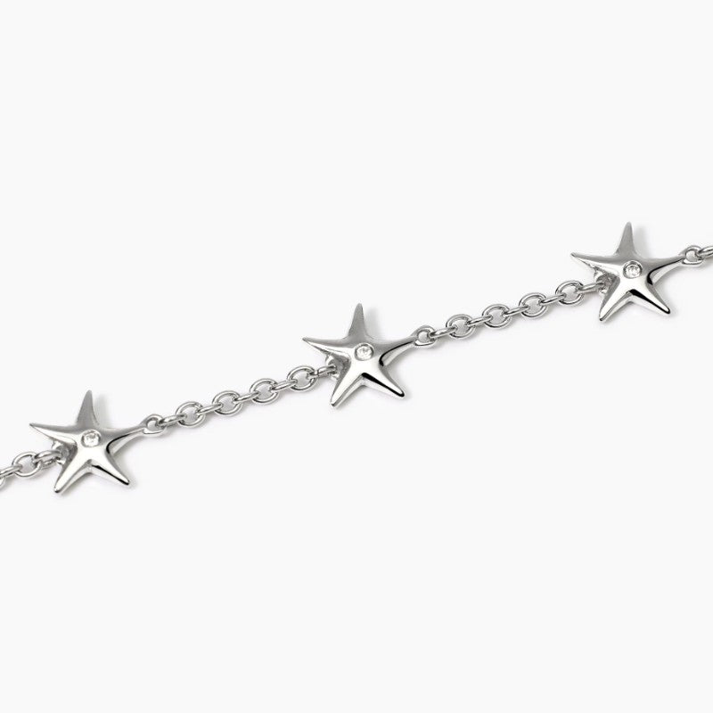 Bracciale con catena rolò e stelle mrine in acciaio e cristalli. Collezione Style 19. Dimensione catena 2,3 mm. Dimensione stelle marine 10,5x10 mm. Diametro cristalli 1,5 mm. Misura regolabile, lunghezza da 16 a 19 cm. Materiale Acciaio 316L, Cristalli.