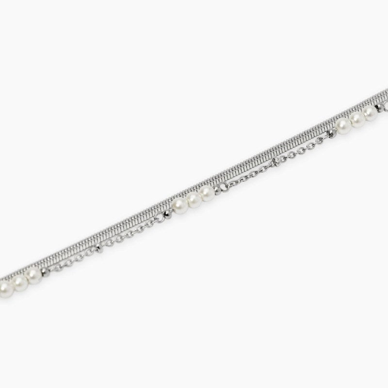 Bracciale regolabile con catena snake e rolò con sfere in acciaio e perle conchiglia. Collezione style 32. Dimensione catena rolò: 1,6 mm. Dimensione catena snake: 2,7 mm. Diametro sfere: 2 mm. Diametro perle conchiglia: 3 mm. Misura regolabile, lunghezza da 16 a 19 cm. Materiale: Acciaio 316L, Perle conchiglia.