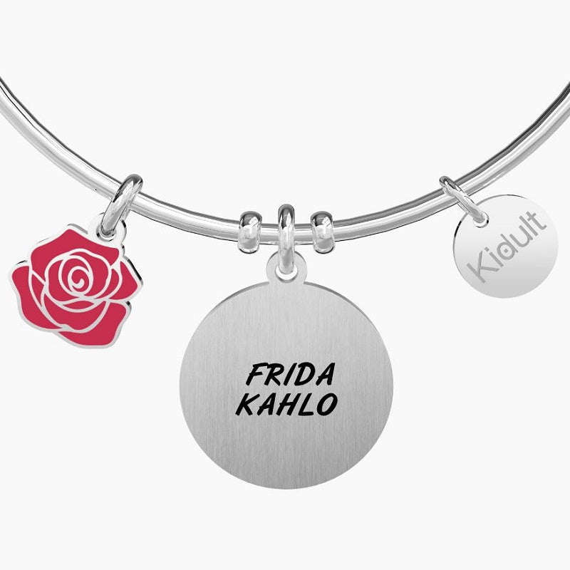Bangle in acciaio con ciondoli satinato tondo e a rosa smaltata rossa. Frida Kahlo Official Collection. Incisione smaltata e smalto rosso sui ciondoli. Chiusura tonda. Misura unica, diametro 6 cm. Materiale: Acciaio 316L, Smalto