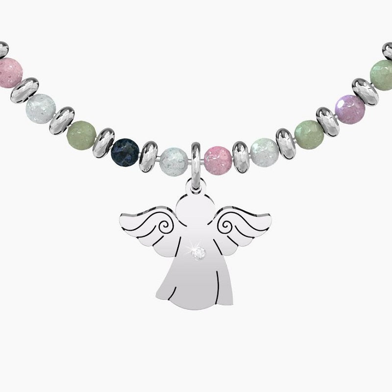 Bangle con filo armonico in acciaio, sfere in agata multicolor e ciondolo ad angelo. Collezione Spirituality. Incisione smaltata e cristallo sul ciondolo. Chiusura con cordino. Misura regolabile, diametro da 5,5 a 6,5 cm. Materiale: Acciaio 316L, Agata, Cristallo.