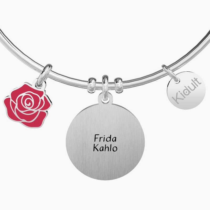 Bangle in acciaio con ciondoli satinato tondo e a rosa smaltata rossa. Frida Kahlo Official Collection. Incisione smaltata sul ciondolo tondo e smalto colorato sul ciondolo a rosa. Chiusura tonda. Misura unica, diametro 6 cm. Materiale Acciaio 316L, Smalto.