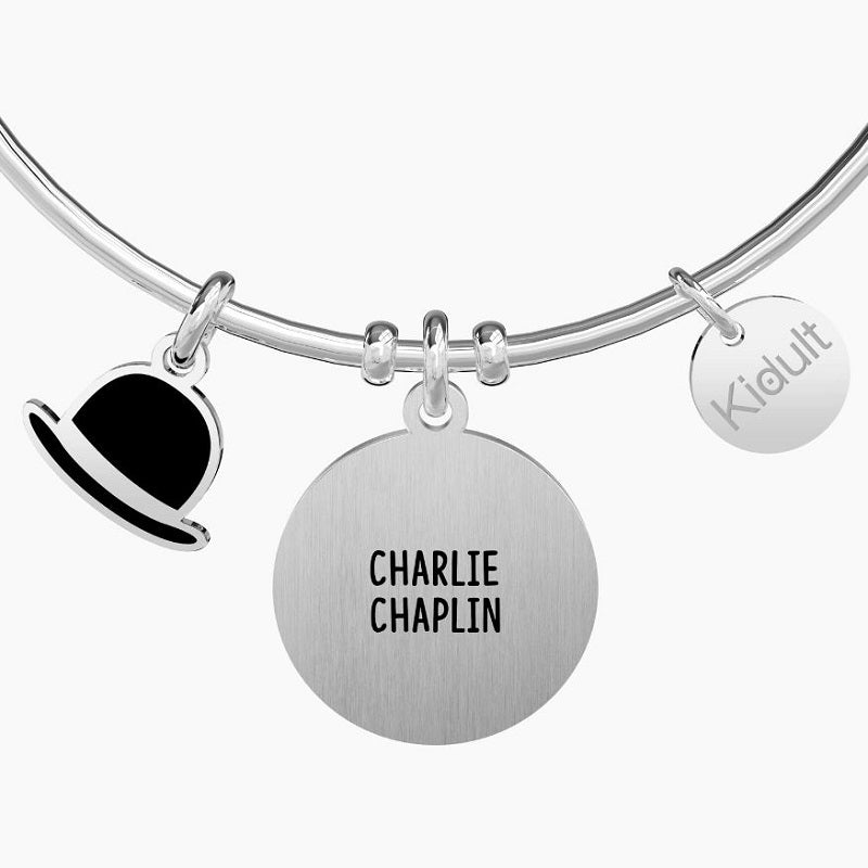 Bangle in acciaio con ciondoli satinato tondo e a bombetta smaltato nero. Charlie Chaplin Official Collection. Incisione smaltata e smalto nero sui ciondoli. Chiusura tonda. Misura unica, diametro 6 cm. Materiale: Acciaio 316L, Smalto.