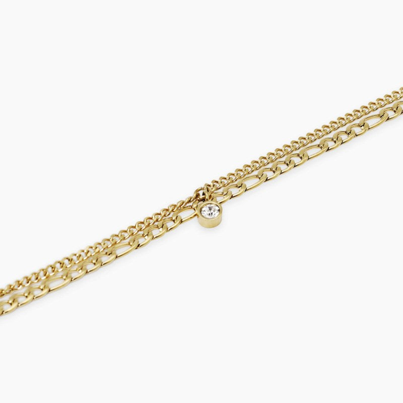 Bracciale regolabile con catene figaro e groumette diamantata in acciaio dorato con ciondolo con cristallo. Collezione style 31. Dimensione catena figaro: 3 mm. Dimensione catena groumette: 1,8 mm. Diametro cristallo: 3,5 mm. Misura regolabile, lunghezza da 16 a 19 cm. Materiale: Acciaio 316L, PVD giallo, Cristallo.