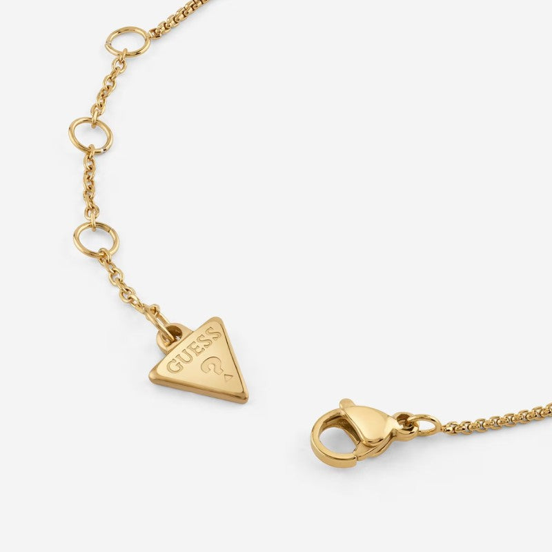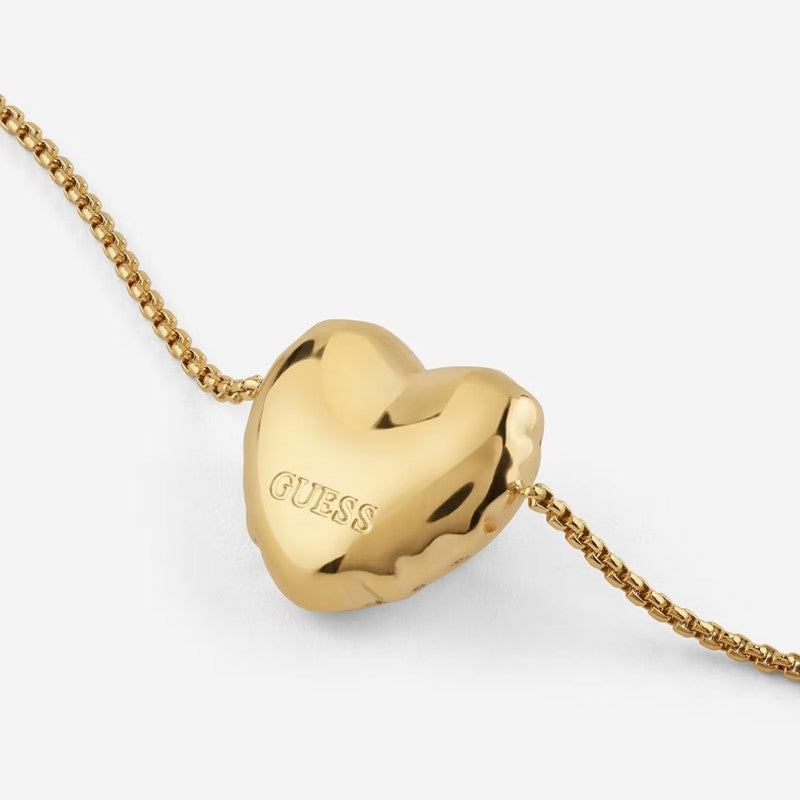 Bracciale da donna in acciaio inossidabile dorato Guess. Struttura a catena regolabile. Ciondolo a forma di cuore. Incisione dettagliata del logo. Chiusura a moschettone. Misura regolabile da 14,6 a 18,4 cm.
