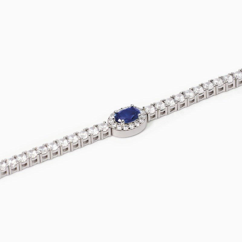 Bracciale tennis da donna in argento rodiato con zaffiro sintetico ovale e zirconi bianchi. Dimensioni zaffiro sintetico: 6 x 4 mm. Diametro degli zirconi: 1,25 mm. Chiusura a pinza con molla. Misura small, lunghezza 16 cm. Misura Medium, lunghezza 18 cm Materiale: Argento 925, Zaffiro sintetico, Zirconi