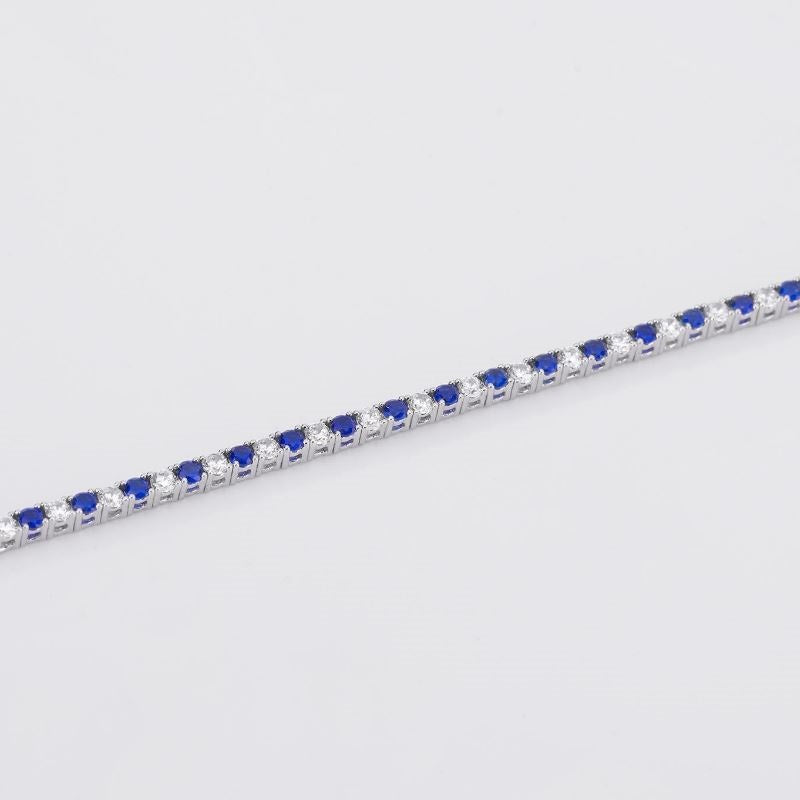 Bracciale tennis in argento con zaffiri sintetici e zirconi. Incastonatura a griffe. Diametro degli zaffiri sintetici e degli zirconi 2,5 mm. Chiusura a pinza con molla. Misura small, lunghezza 16 cm. Materiale Argento 925, Zaffiro sintetico, Zirconi.