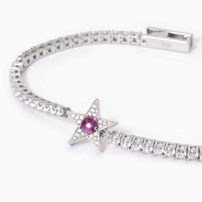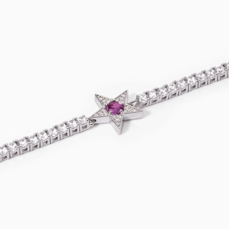 Bracciale tennis in argento con stella in pavé di zirconi bianchi con tormalina sintetica centrale. Incastonatura zirconi a griffe. Chiusura a pinza con molla. Diametro tormalina sintetica: 4 mm. Diametro zirconi: 2.5 mm. Misura small, lunghezza 16 cm. Materiale: Argento 925, Tormalina sintetica, Zirconi.