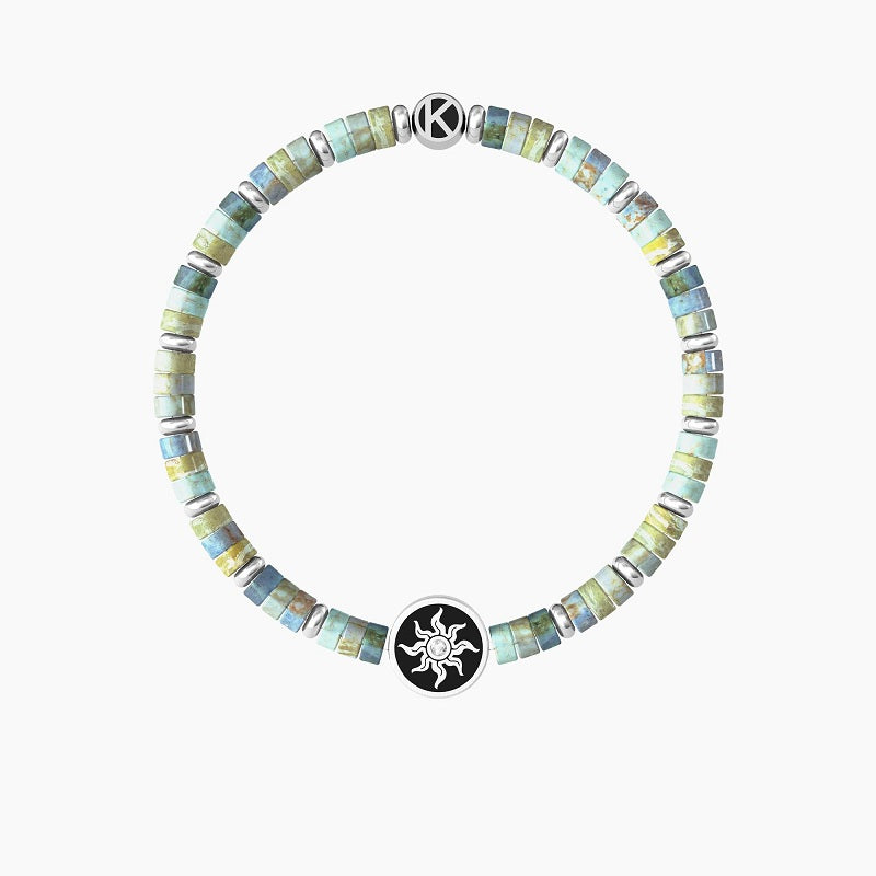 Bracciale elastico da uomo con cilindri in diaspro azzurro alternati. Anelli in acciaio e piastra tonda di colore nero. Con sole e cristallo nero sul retro. Collezione Symbols. Incisione smaltata e cristallo nero sul retro. Diametro della piastra: 12 mm. Diametro del cristallo: 1,75 mm. Dimensione delle pietre: 4,5 x 2,5 mm. Misura unica, lunghezza 20,5 cm. Materiale: Acciaio 316L con Pvd Nero, Diaspro azzurro, Cristallo
