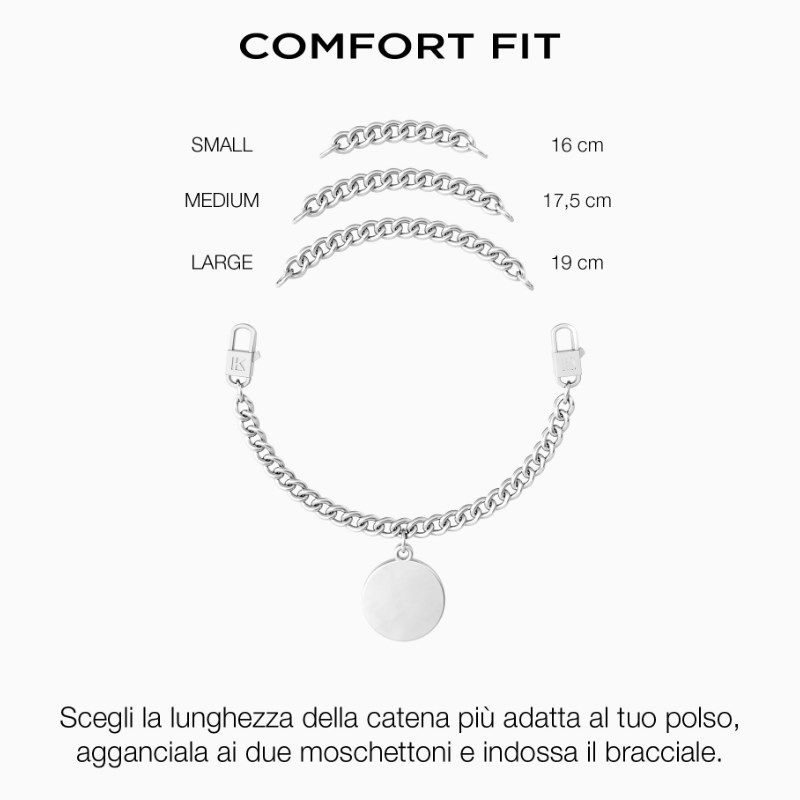 Bracciale regolabile Comfort Fit in acciaio con catena forzatina allungata e ciondoli a forma di cornetto smaltato, quadrifoglio e cerchio con cristallo bianco e scritta "Good luck". Dimensione del ciondolo: 12 mm. Dimensione del quadrifoglio: 11 x 15 mm. Dimensione del cornetto: 6,5 x 17,5 mm. Diametro del cristallo: 1,5 mm. Chiusura con moschettoni e adattamento "comfort fit". Misura Small, lunghezza 16 cm; misura Medium, lunghezza 17,5 cm; misura Large, lunghezza 19 cm. Materiale: Acciaio 316L, Cristallo