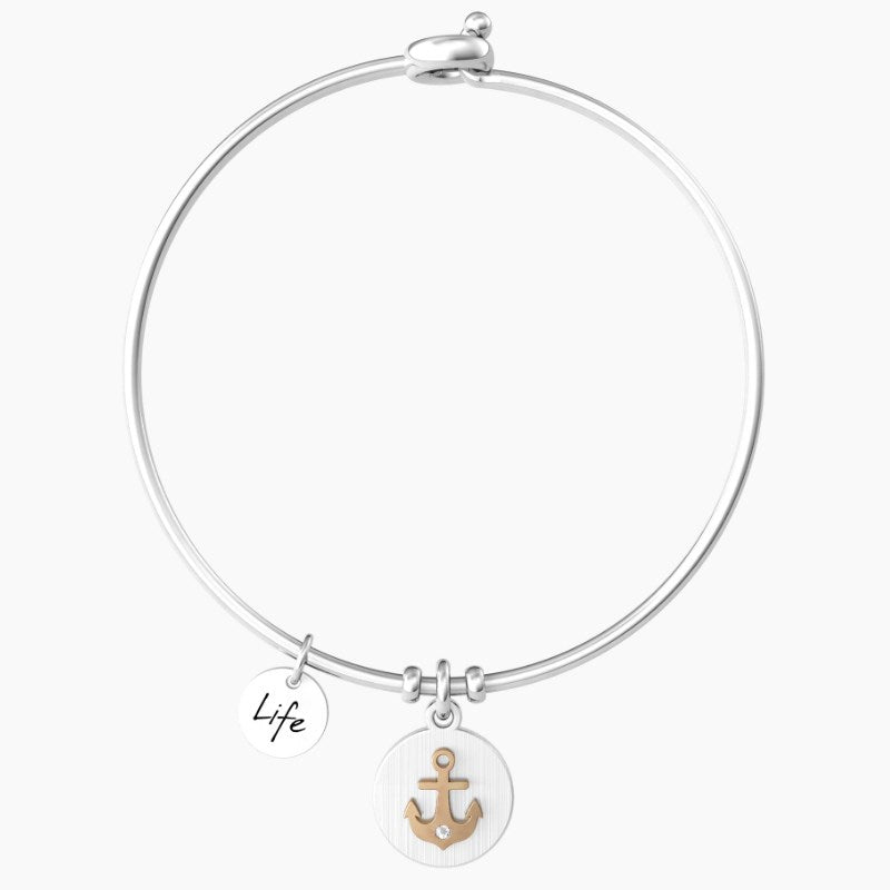 Bangle in acciaio con ciondolo satinato con ancora rosé lucida, cristallo e scritta "Strong and brave". Collezione Symbols. Misura unica, diametro 20 cm. Diametro del ciondolo tondo grande: 6 cm. Diametro del ciondolo tondo piccolo:15 mm. Chiusura tonda. Materiali: Acciaio 316L con PVD rosé lucido, Cristallo.