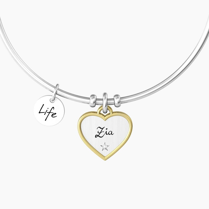 Bracciale bangle da donna in acciaio con ciondolo lucido e satinato a forma di cuore con bordo e retro in PVD giallo, cristallo bianco e frase "Ti voglio bene". Dimensione del ciondolo: 17 x 17,5 mm. Diametro del cristallo: 1.5 mm. Misura unica, circonferenza 20 cm. Materiale: Acciaio 316L, Pvd giallo, Cristallo
