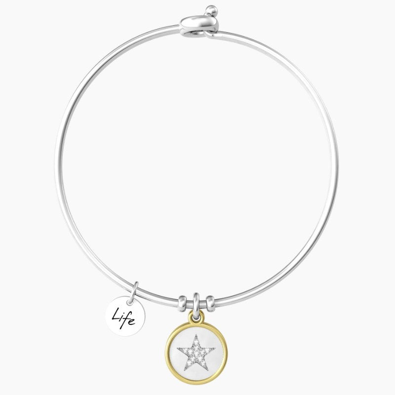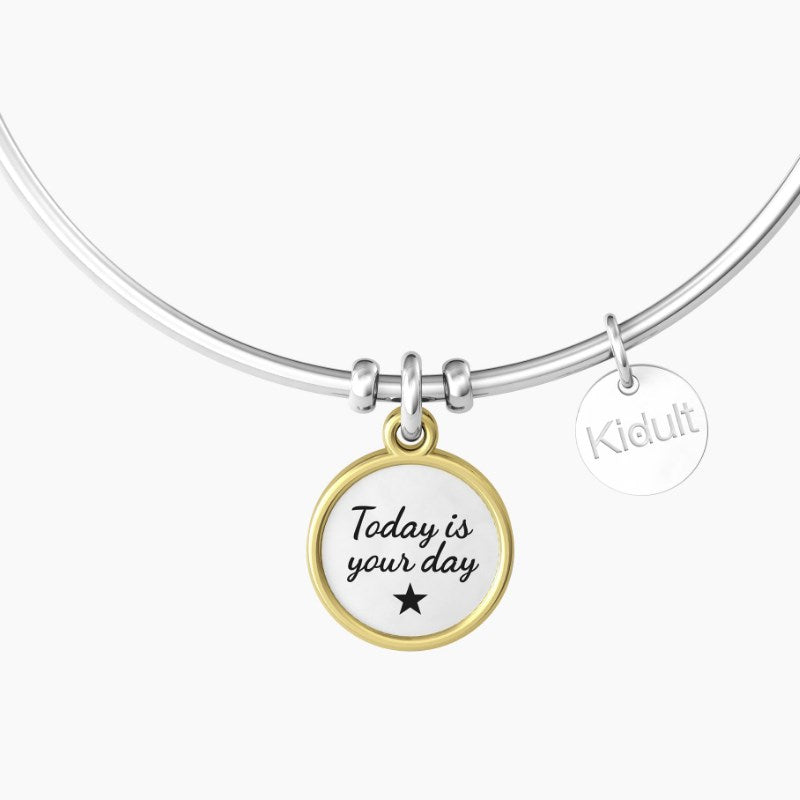 Bangle in acciaio con ciondolo tondo satinato con bordo lucido dorato, cristalli bianchi e scritta "Today is your day", Misura unica. Collezione Special Moments. diametro 20 cm. Diametro del ciondolo tondo grande: 6 cm. Diametro del ciondolo tondo piccolo: 15 mm. Diametro dei cristalli: 1.25 mm. Chiusura tonda. Materiali: Acciaio 316L con PVD oro lucido, Cristalli bianchi.