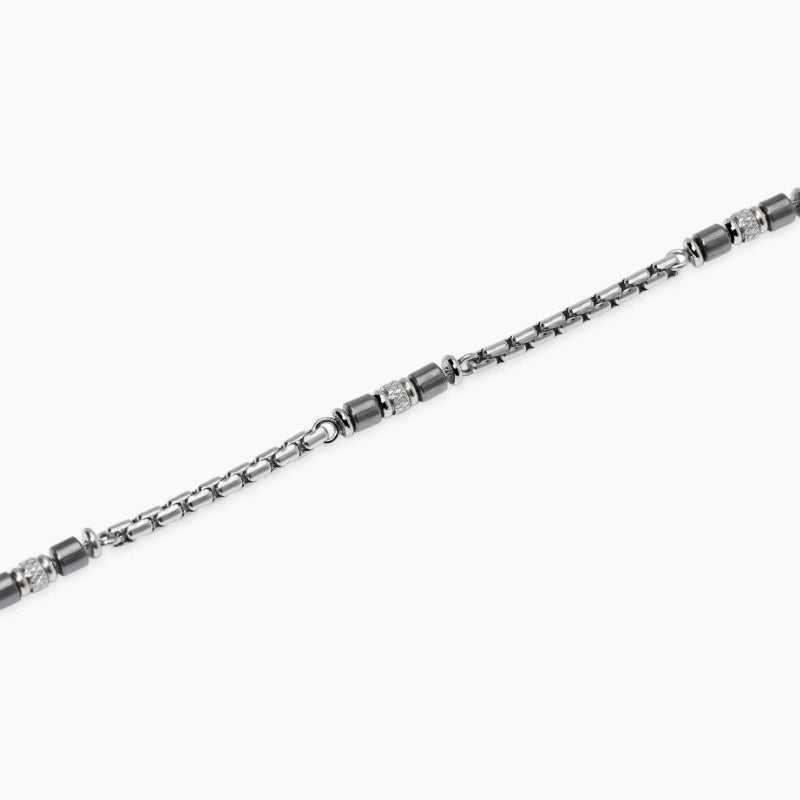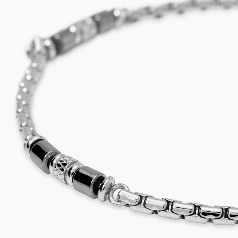 Bracciale regolabile in acciaio con catena veneta, elementi a strisce e cilindri di ematite. Collezione style 03. Dimensione elementi: 5x4 mm. Dimensione ematite: 4x4 mm. Misura regolabile, lunghezza da 19 a 21 cm. Materiale: Acciaio 316L, Ematite.