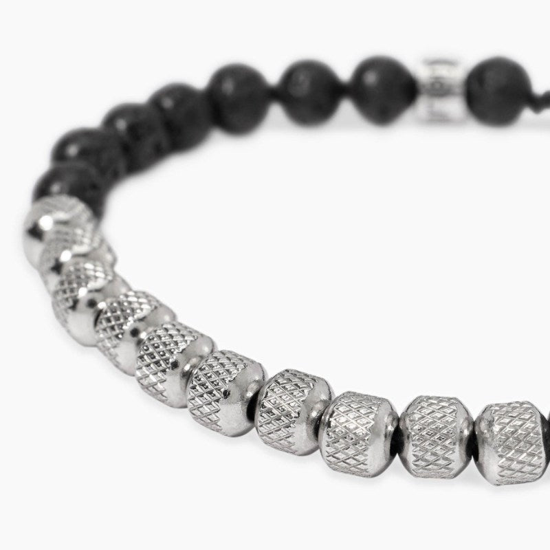 Bracciale regolabile in nylon nero, pietra lavica e cilindri in acciaio. Collezione style 33. Dimensione cilindri: 5,5x6,1 mm. Diametro pietre: 6 mm. Misura regolabile, lunghezza da 15,5 a 26,5 cm. Materiale: Acciaio 316L, Nylon, Pietra lavica.