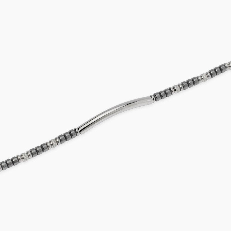 Bracciale regolabile in acciaio con elementi a strisce, cilindri in ematite e piastra centrale. Collezione style 23. Dimensione elementi: 3,5x4 mm. Dimensione ematite: 2x9x4 mm. Dimensione piastra: 4x40 mm. Misura regolabile, lunghezza da 19 a 21 cm. Materiale: Acciaio 316L, Ematite.