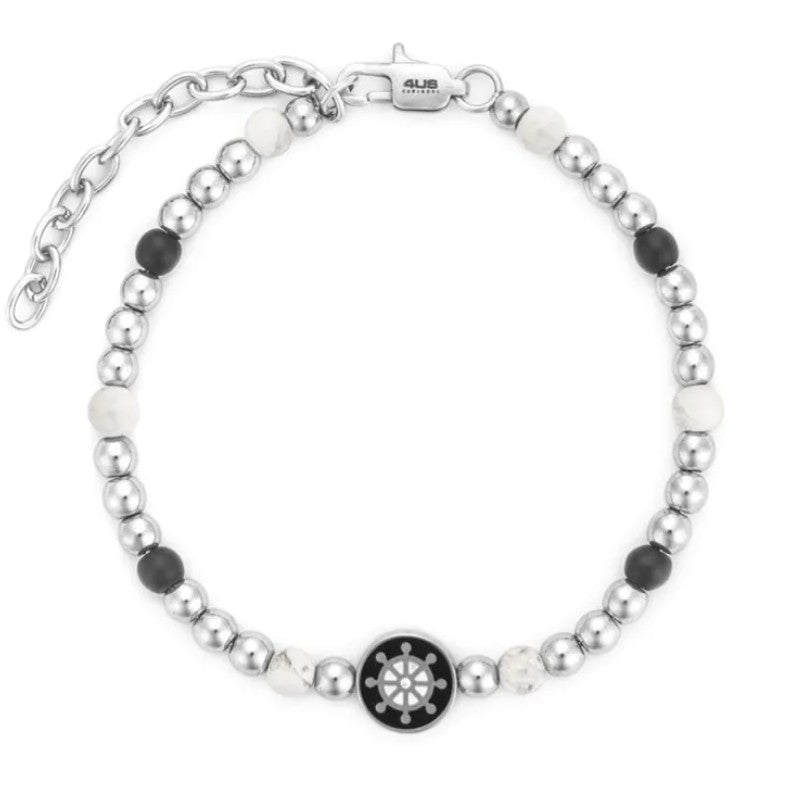 Bracciale da Uomo realizzato in acciaio inossidabile 316L. Bracciale caratterizzato da boule tonde e valorizzato con pietre di onice nera e howlite bianca, è impreziosito da una medaglia tonda centrale smaltata di colore nera con raffigurato un timone smaltato di colore bianco. Chiusura con moschettone. Lunghezza regolabile da 18 a 21 cm.