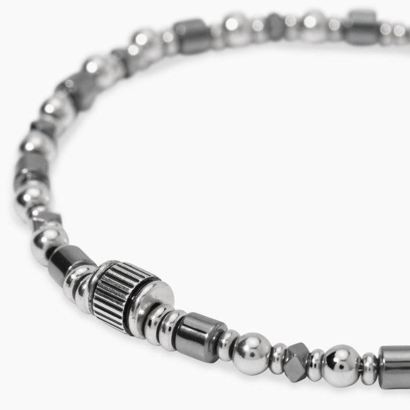 Bracciale regolabile in acciaio con con elemento centrale a strisce, cilindri e cubetti faccettati in ematite. Collezione style 27. Dimensione elemento: 6,6x6 mm. Diametro cilindri: 3,7 mm. Dimensione ematite: Ø4 e 2,7x2,7 mm. Misura regolabile, lunghezza da 19 a 21 cm. Materiale: Acciaio 316L, Ematite.