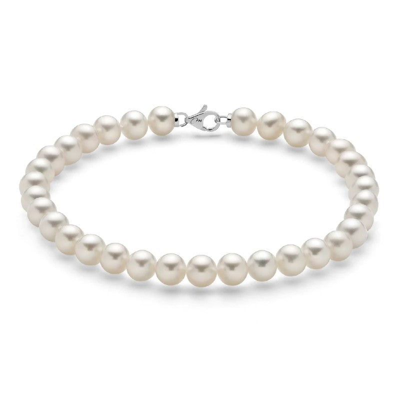 Bracciale con perle della collezione Miluna Perle Con Chiusura da donna. Colore: oro bianco e bianco. Il gioiello è composto da un filo di perle coltivate bianche ø 5-5,6 con chiusura a moschettone in oro bianco 750‰ (18Kt).