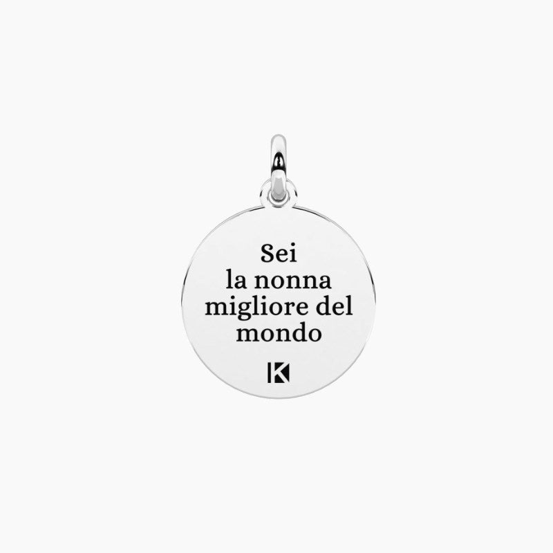 Ciondolo in acciaio satinato con scritta "Ti sei presa cura di me, con amore e dolcezza" e sul retro "Sei la nonna migliore del mondo" e cristallo. Collezione family. Diametro ciondolo: 15 mm. Diametro cristallo: 1,25 mm. Materiale: Acciaio 316L, Cristallo.