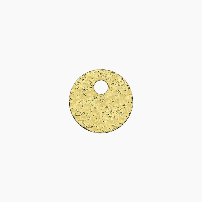 Ciondolo tondo per orecchini in acciaio dorato effetto martellato. Collezione Symbols. Diametro ciondolo: 13,5 mm. Materiale: Acciaio 316L, PVD giallo.