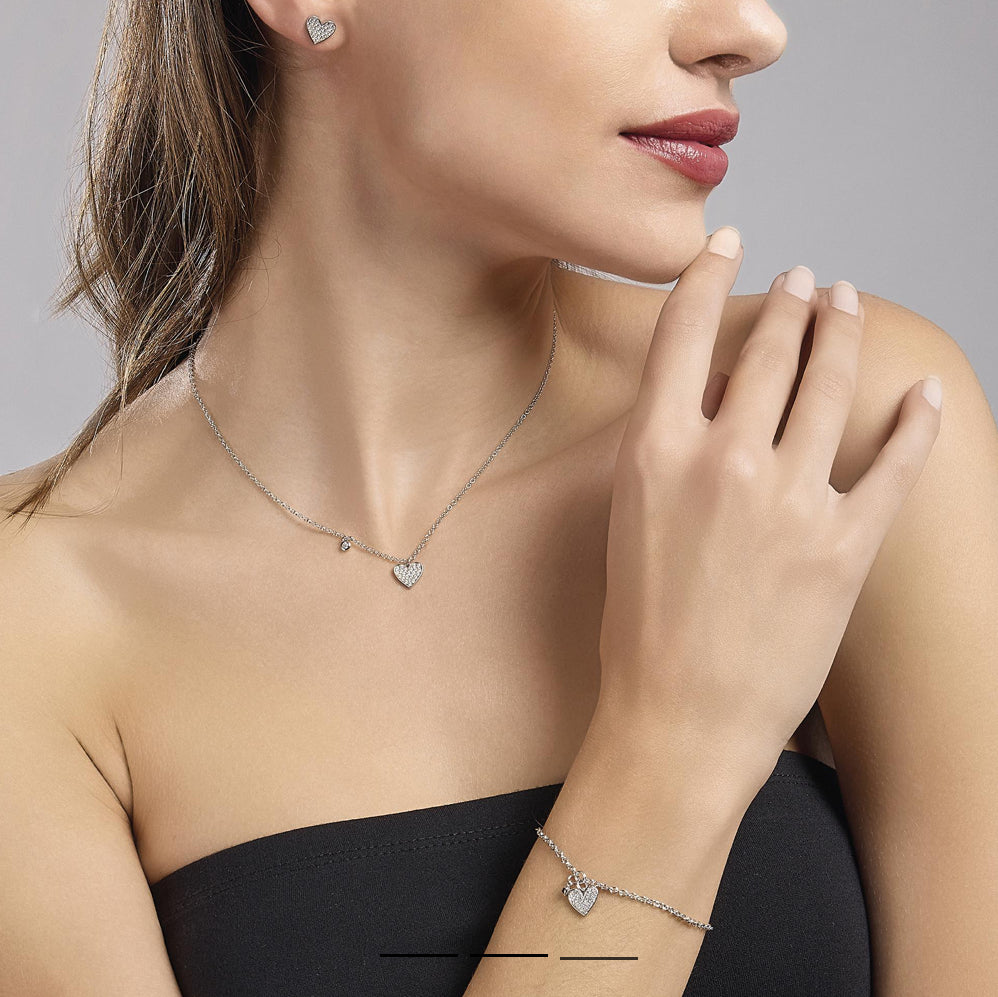 Girocollo in argento con ciondolo a cuore in pavé di zirconi e punto luce. • Incastonatura dello zircone a castone • Dimensione del cuore: 8 x 9 mm • Diametro degli zirconi: 2 mm, 1,2 mm e 1 mm • Chiusura con moschettone • Misura regolabile, lunghezza da 40 a 45 cm • Materiale: Argento 925, Zirconi
