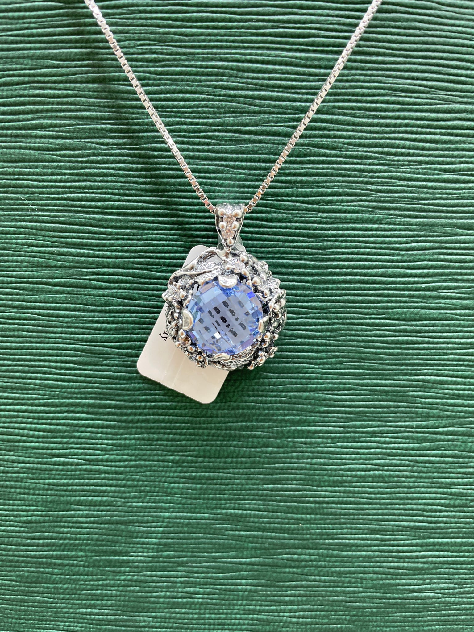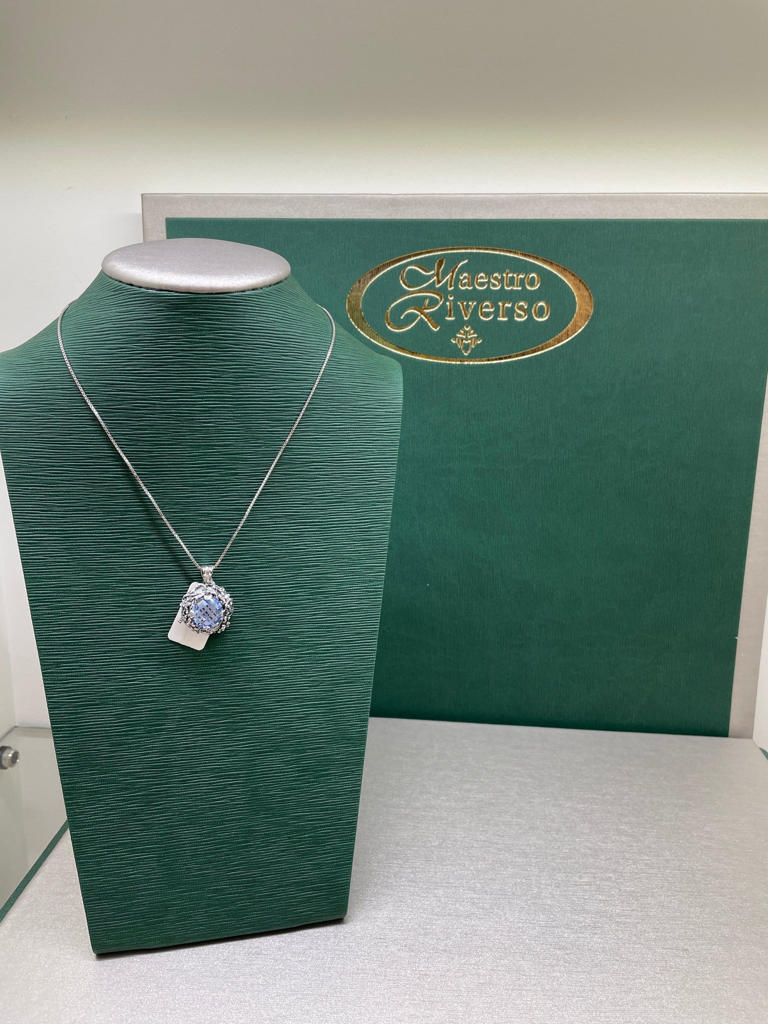 Maestro Riverso. Gioiello in Argento 925/000 cristalli colorati e zirconi. Realizzato a mano in Italia e corredato di Garanzia e Certificato di Autenticità. Pietre Incassate 9 Zirconi Pietra Centrale Cristallo Colorato 12 mm Colore Topazio Azzurro Dimensioni 2.1 x 2 cm Catena Veneziana 45 cm.