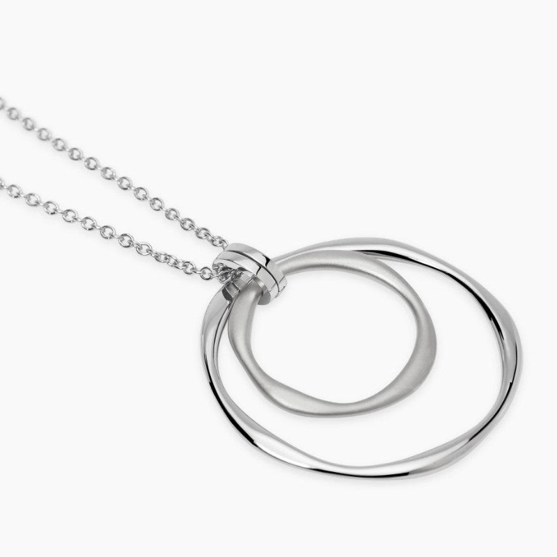 Collana in acciaio con catena rolò e doppio pendente, uno lucido e uno sabbiato. Dimensione ciondolo sabbiato: 29x29 mm. Dimensione ciondolo lucido: 44x43 mm. Misura unica, lunghezza 75 cm. Materiale: Acciaio 316L.