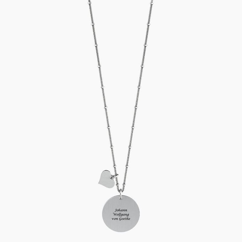 Collana lunga in acciaio con ciondolo satinato tondo e catena groumette con anellini. Collezione Philosophy. Incisione smaltata sul ciondolo. Chiusura con moschettone. Misura unica, lunghezza 80 cm. Materiale: Acciaio 316L.
