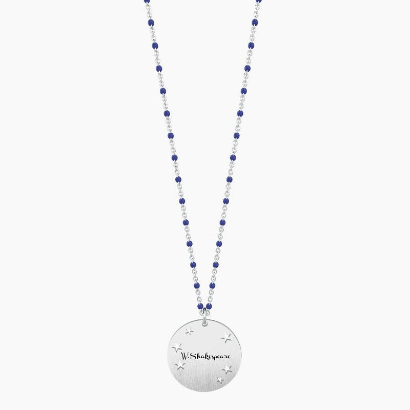 Collana lunga in acciaio con ciondolo satinato tondo e catena rolò con inserimenti in smalto blu. Collezione Philosophy. Incisione smaltata sul ciondolo e inserimenti in smalto sulla catena. Chiusura con moschettone. Misura unica, lunghezza 80 cm. Materiale: Acciaio 316L, Smalto.